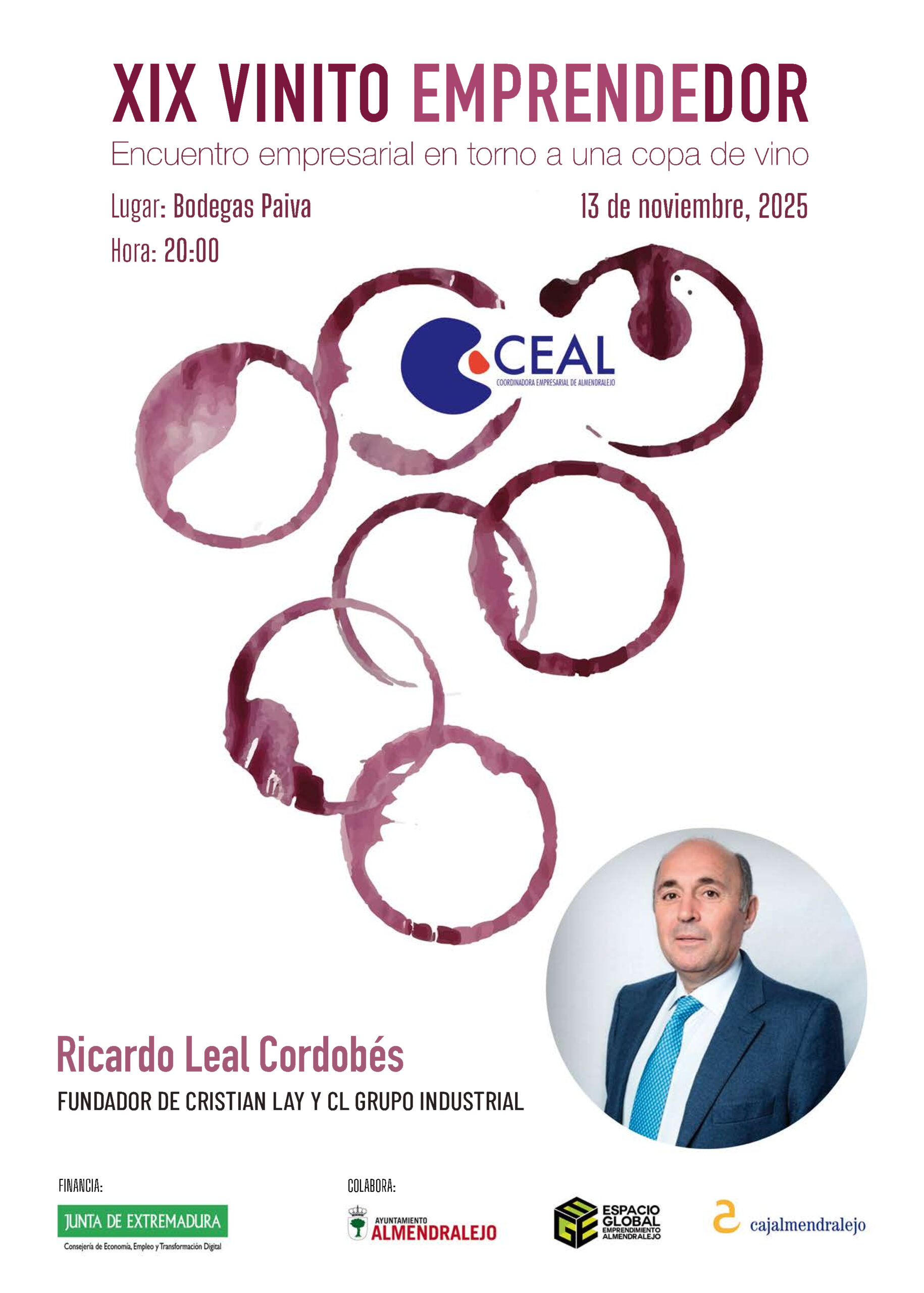 Este encuentro del “XIX VINITO EMPRENDEDOR” será el JUEVES DÍA 13 de Noviembre , a las 20:00 HORAS, y en Bodegas Paiva, de Almendralejo. Allí conoceremos a RICARDO LEAL , así como su trayectoria Profesional , y podremos disfrutar de un nuevo encuentro empresarial.